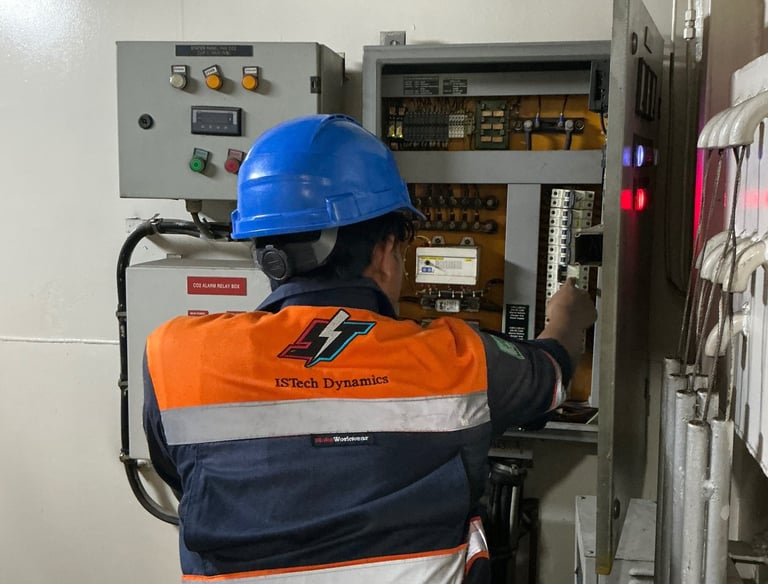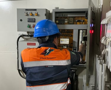 Desain dan instalasi panel listrik serta kontrol PLC/HMI presisi.